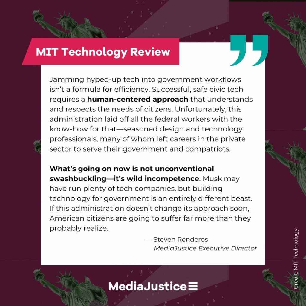 Our Executive Director, Steven Renderos, details in the MIT Technology Review how Musk’s incompetence will have lasting harms on our critical federal infrastructure and our communities’ data that is housed within.
